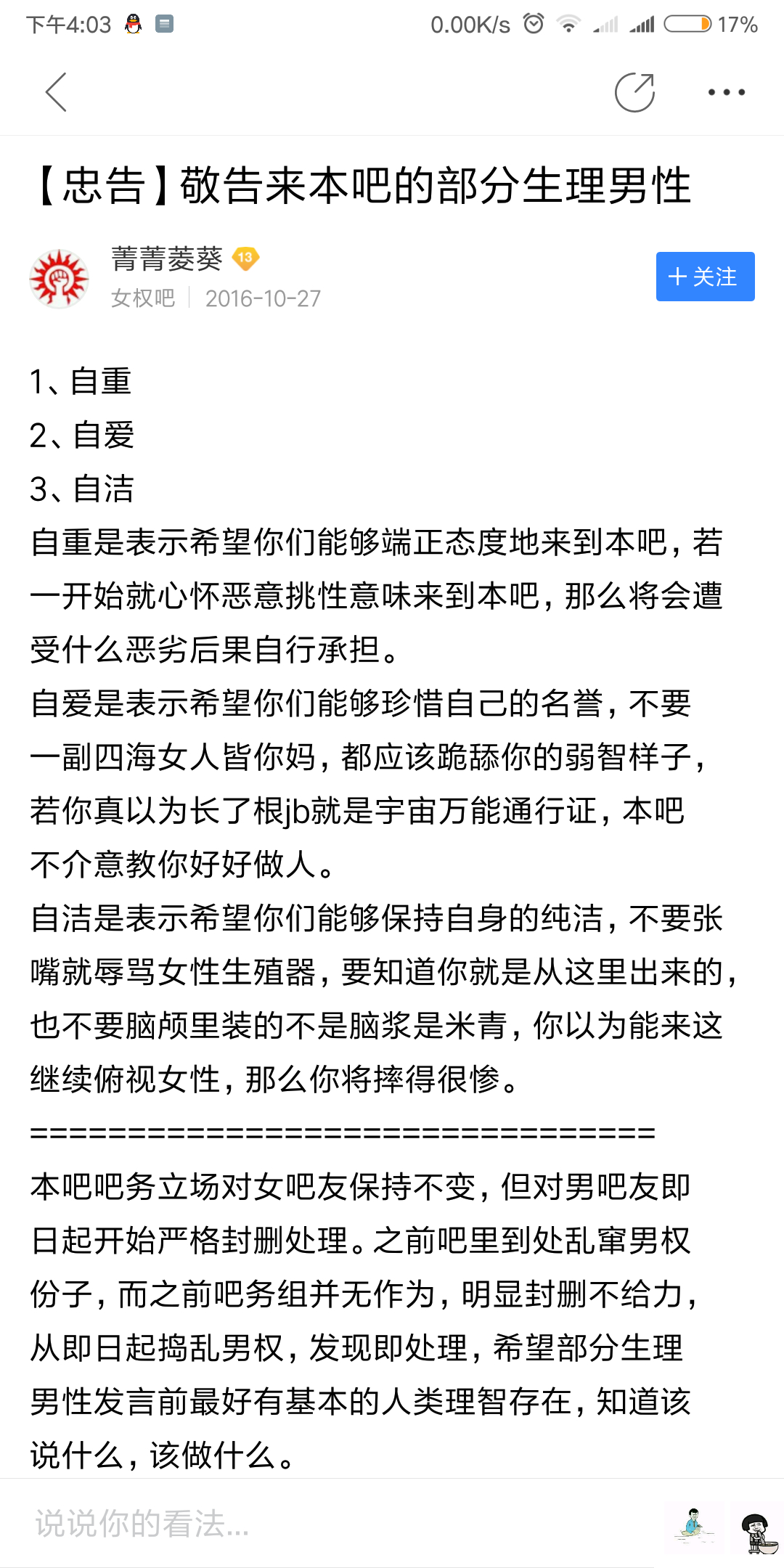 【Android反馈】申请禁封女权吧及女权吧吧!