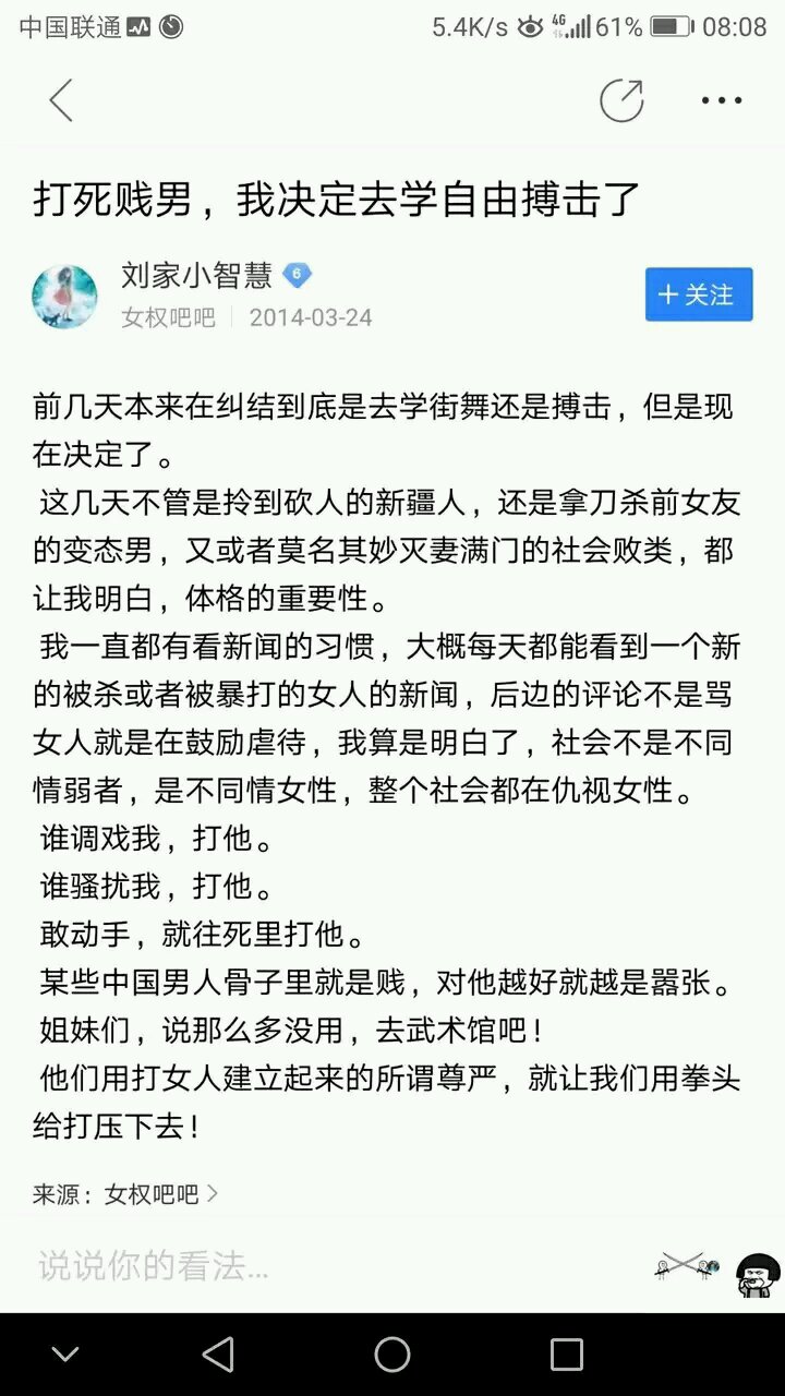 我们的豌豆 新海天🍺这些现象确实有吧,但是感觉女权吧有时对所有的男性都攻击,跪舔外国人,挑拨社会矛盾,侮辱男性同胞,这些都是没得洗的- 甚至还号召性解放,阉割所有男性的生殖,前些日子还听新闻说外国人拐骗女孩在境外被杀,我都怀疑这背后有巨大的产业链了