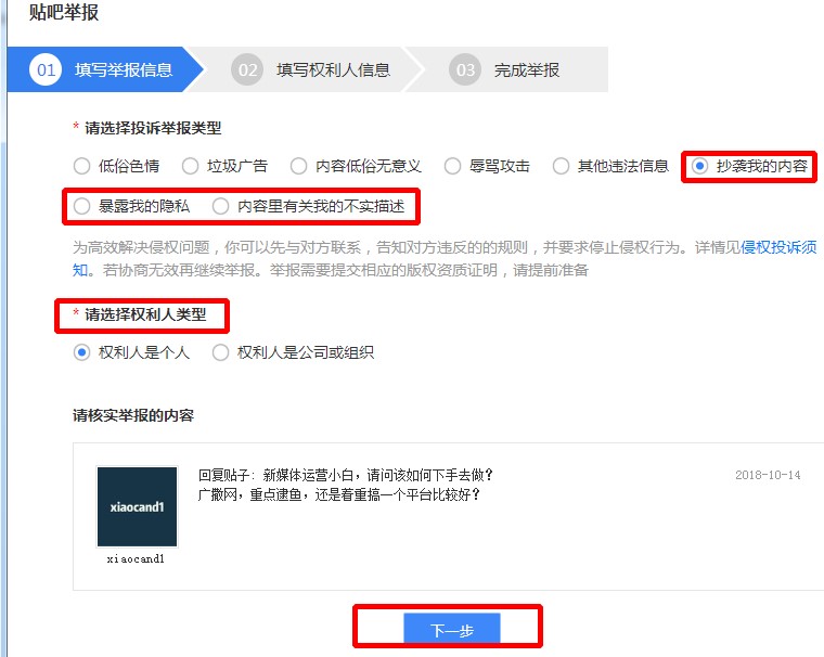 手机端用户:点击您要举报的贴子右上方的三点水符号,即可进入投诉页面(如图1),电脑端用户点击违规贴子楼层下方的举报按钮即可进入投诉页面(如图2),进入投诉页面后选择您要举报的类型,选择权利人类型,点击下一步,补充完善权利人信息,注意*为必填项~点击提交即可投诉~如下图: