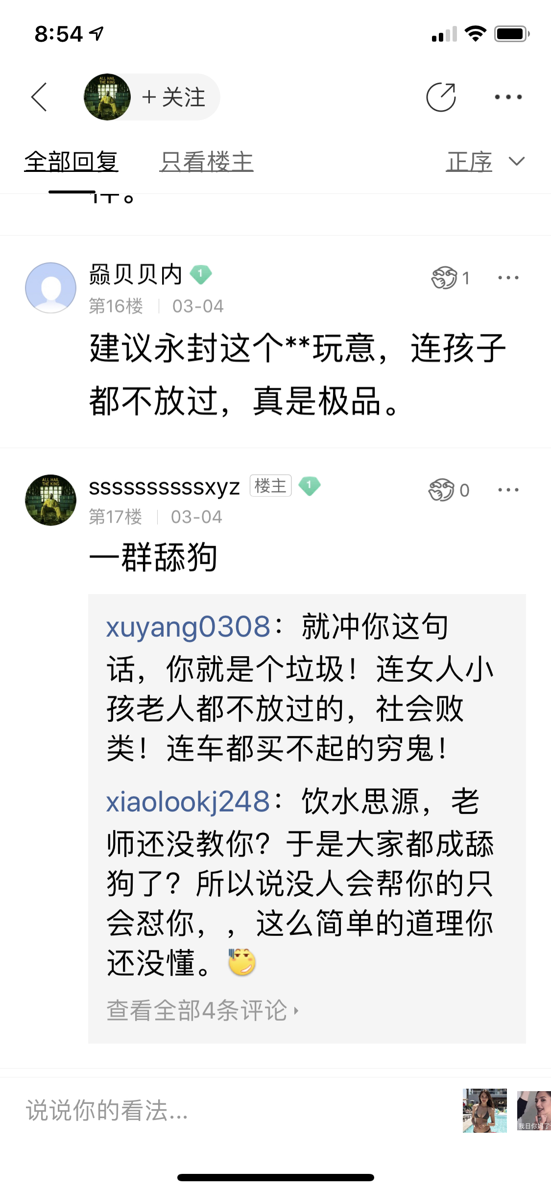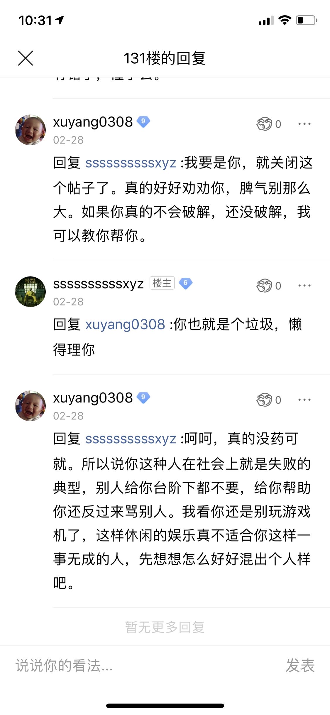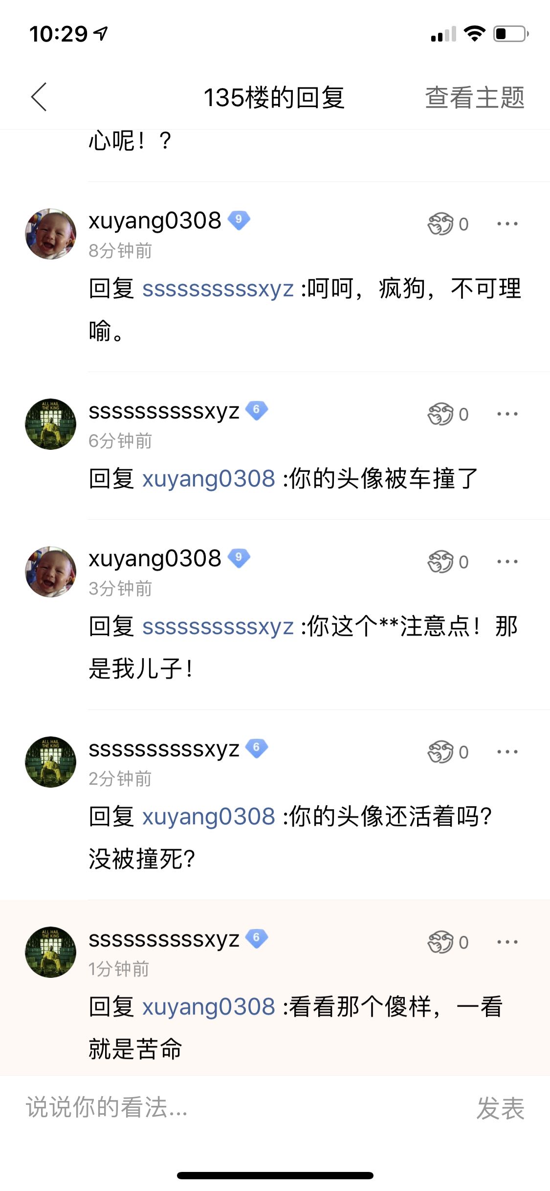 xuyang0308谢谢小吧主!这人真的是恶心!老人小孩都不放过!张口说什么骂人不对,自己先骂商家,吧友看不惯他断章取义装可怜,说他几句他就连人家家里老人小孩都骂!如果心里不是那么恶毒的人,怎么说得出这样的话!