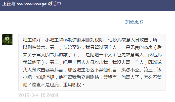 ssssssssssxyz回复: 你说我故意人身攻击,所以删帖禁言。第一,从始至终,我只骂过两个人,一是无良的商家(后来我道歉了),二是贴吧某人(它先故意骂人)。第二,吧里上百人人身攻击我,我没去骂一个人,既然说我人身攻击就禁我言,那么吧主怎么不禁他们言,执法不公。
