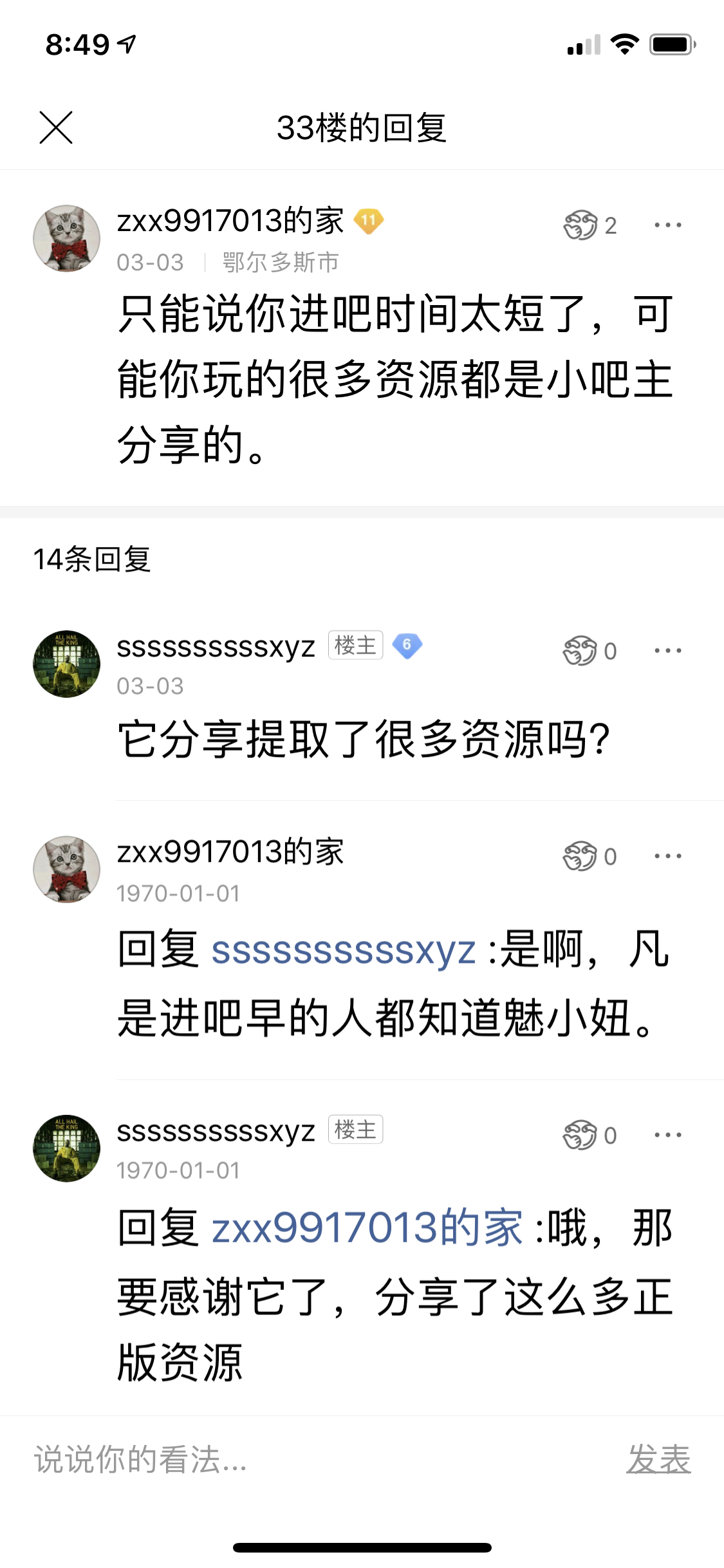 今天周壹回复:你违反了那条吧规,这层一开始就说清楚了。要说找大吧主,你后一个帖子里已经有两位吧主回复你了,并没有觉得冤枉了你,甚至还有一位吧主在看过你“舌战群儒”的表演后,直接给了你新任吧宠的称号