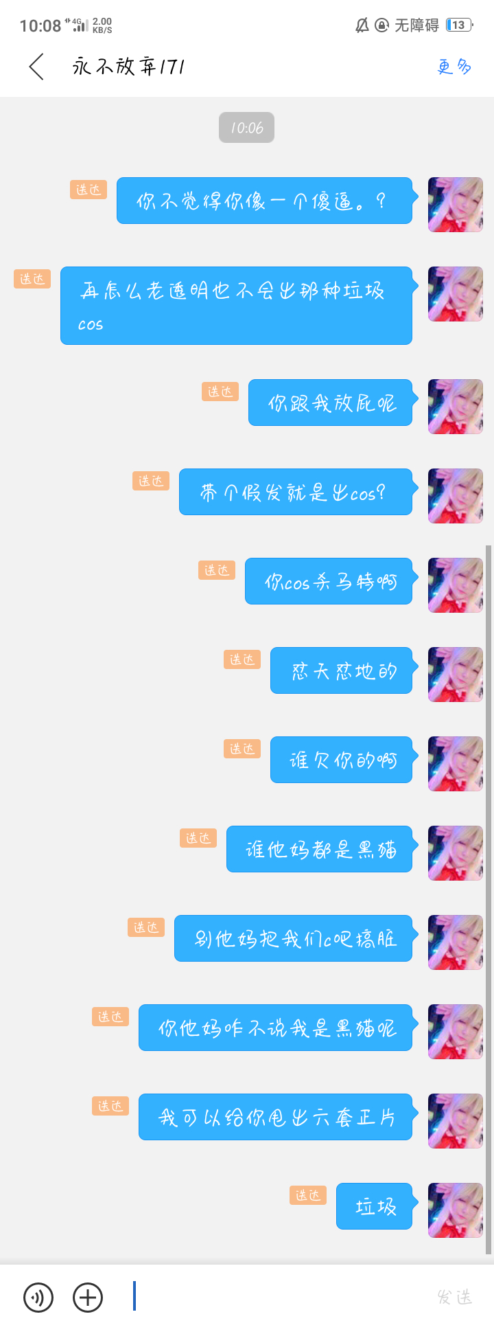 莼子_中二少男回复 天命主教◆奥托 :这人是疯子mmp的见人就说是黑猫小号,这人得多恨黑猫?人家黑猫鸟不鸟他他就在这里整天**逼,还说黑猫不是coser这很迷。永不放弃171号称玩了4还是6年的漫展cos却只出过2次,据我所知黑猫出了至少15个以上角色cos她有这个回忆记录贴可以查看。那个永不放弃171说她不是coser很迷