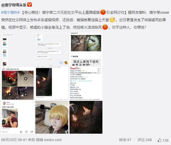 4楼pid:1262203799482019/06/22 15:54:55墨家の古渐离 楼主 1级 6月20日,微博上有人反映说,南宁一名coser在其社交平台上放了许多自己虐猫的照片和动图,还说了一些过激的言语,引发网友众怒。被爆料的这位coser随后发出另一张手夹猫脖子的图片并回贴称:“法律又没有禁止虐猫。”