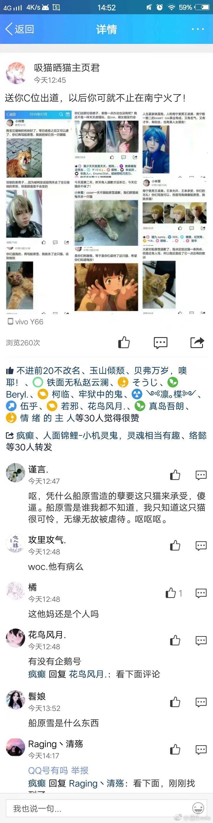 cosplay吧 【挂人】广西某Coser晒虐猫视频,称是为了还原tid:61711146772019/06/22 15:43:348331 1 0楼主:墨家の古渐离最后回复:金色长毛02019/06/25 12:58:011楼pid:1262202262712019/06/22 15:43:34墨家の古渐离 楼主 1级 qq已经搜索不到这个人的号了,应该是被封号了。但是封号有什么用呢,肯定还会开小号继续的2楼pid:1262202711932019/06/22 15:46:50墨家の古渐离 楼主 1级 虐猫者的微博。高P注目。3楼pid:1262203380432019/06/22 15:51:48墨家の古渐离 楼主 1级 新闻报道了,cos圈的风评严重被害[[外站视频:https://www.bilibili.com/video/av56417295]]4楼pid:1262203799482019/06/22 15:54:55墨家の古渐离 楼主 1级 6月20日,微博上有人反映说,南宁一名coser在其社交平台上放了许多自己虐猫的照片和动图,还说了一些过激的言语,引发网友众怒。被爆料的这位coser随后发出另一张手夹猫脖子的图片并回贴称:“法律又没有禁止虐猫。”5楼1条pid:1262204226422019/06/22 15:58:06墨家の古渐离 楼主 1级 还不是第一次作案,往年挂他的帖子众多,稍微在百度上搜他的名字,就会发现其常年以顶族、虐猫为乐墨家の古渐离 楼主 层主 1级 ·6楼pid:1262204923652019/06/22 16:03:20墨家の古渐离 楼主 1级 网友展开了人肉。7楼pid:1262373752152019/06/23 18:05:21请爱护动物231贴吧用户_5VW958C1级 大家搞一下这个人,去年在闲鱼出售虐猫视频的,还有不少小号,一网打尽!8楼pid:1262655401512019/06/25 12:58:01金色长毛01级 求求大家人肉这个人,他有30多个小号,必须找出来