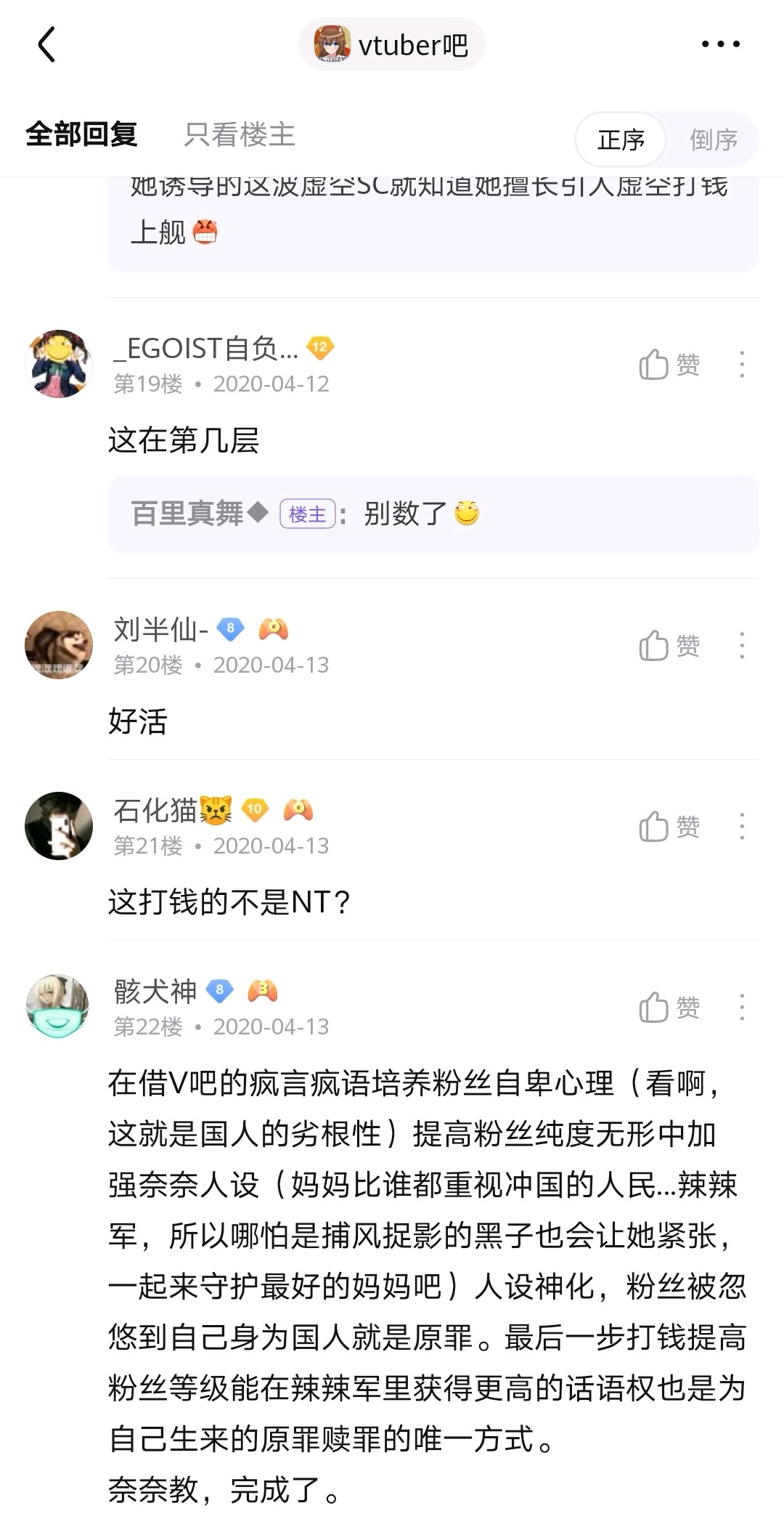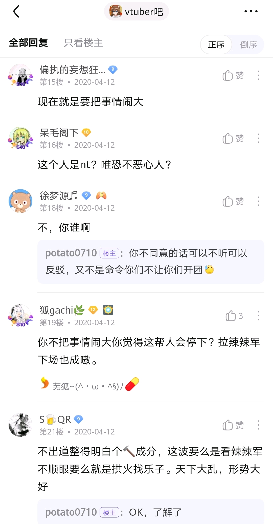 再补充一个题外话,自此次事件后,吧友们由于长期受到使徒的熏陶,居然对使徒产生了耐受性,百毒不侵,之后还反过来对无吧主状态的府吧进行使徒攻击😅致使府吧一时间人流量大减,这当然是后话了