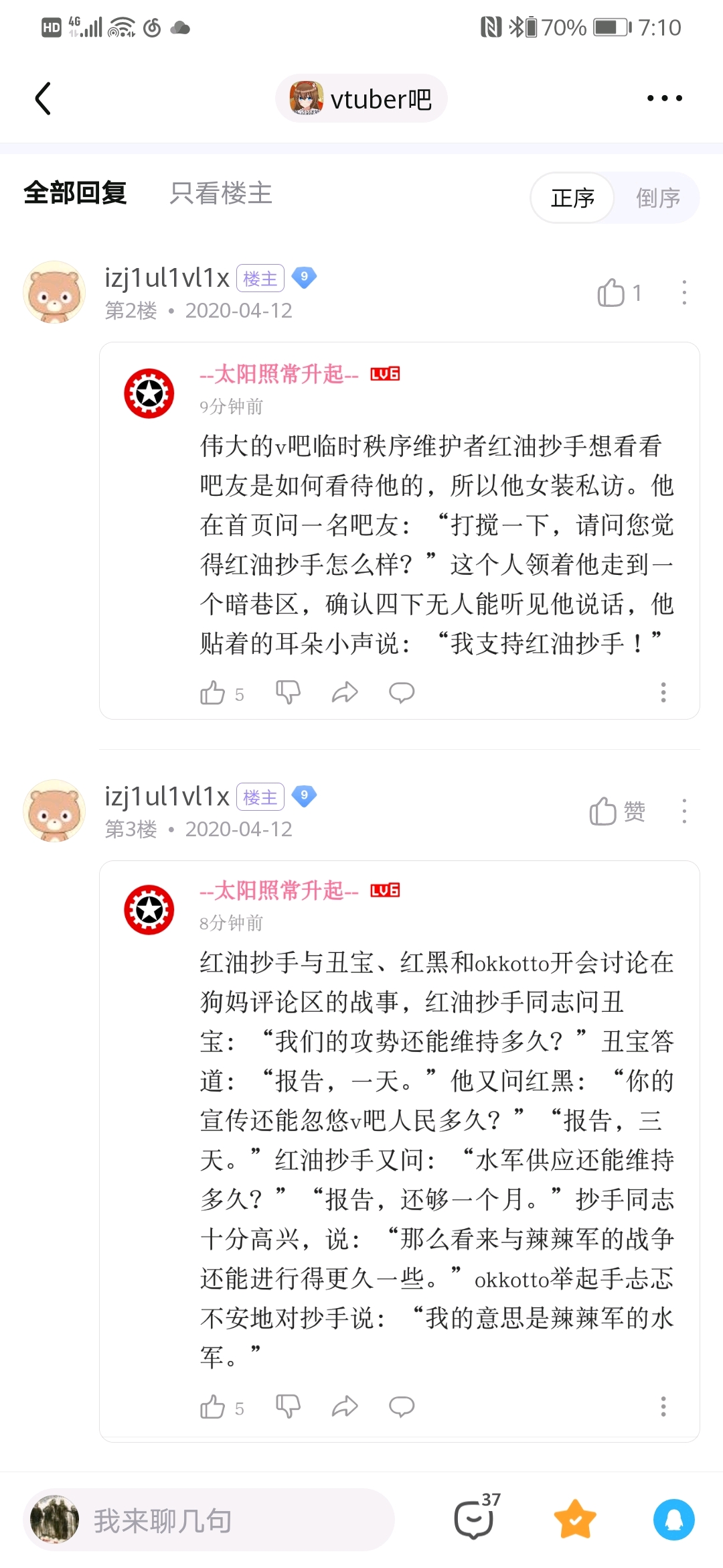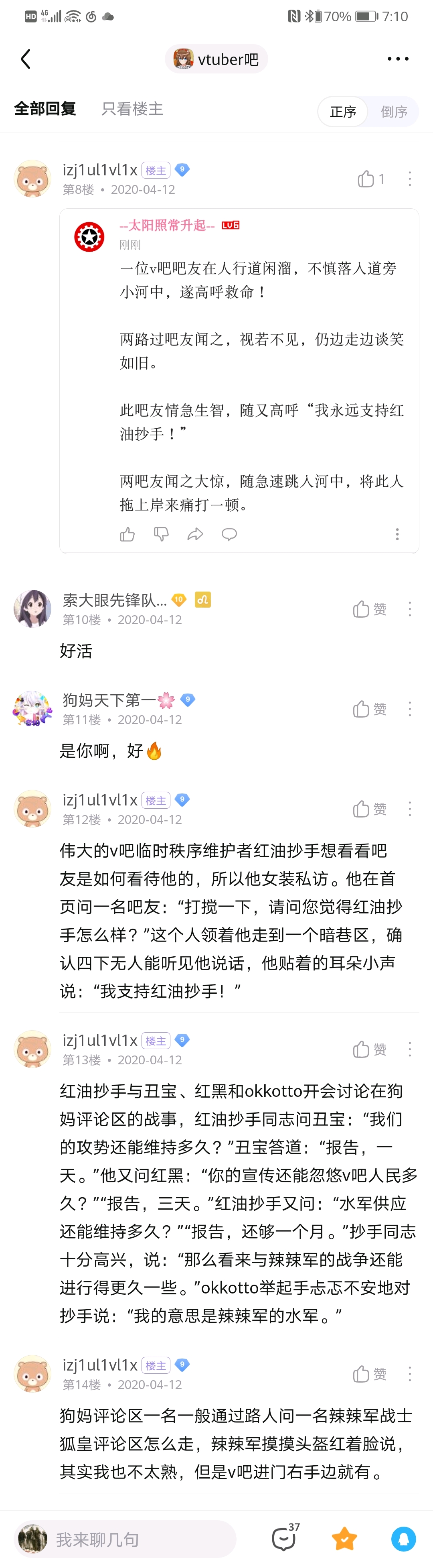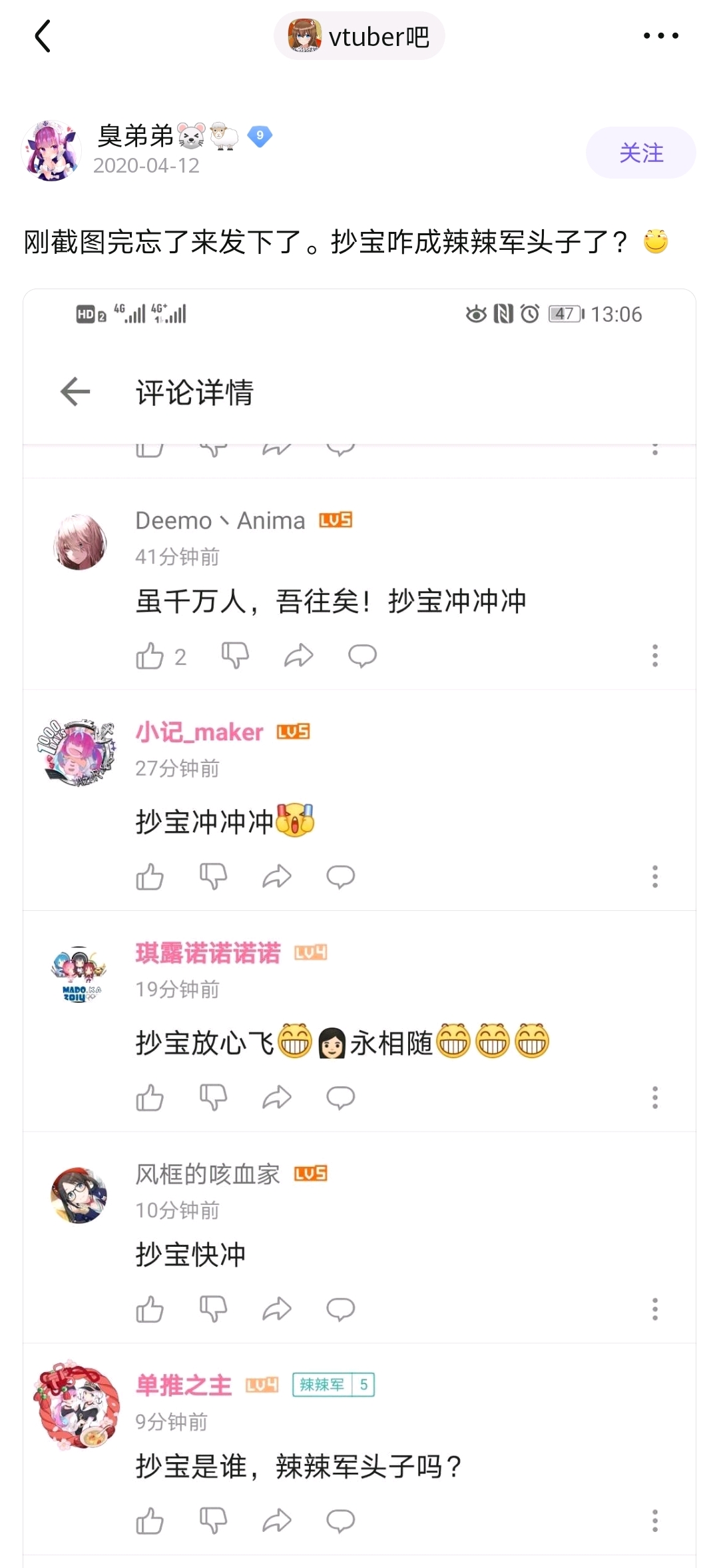 休宝那个贴子我竟然看过,我就是顺着他的帖子去找录播的,我当时没看发帖人ID就当笑话看的,后来使徒爆吧我也不知道是辣椒军,老长一段时间后才听说休宝的大名,但一直懒得补🍉,当时不经常看贴吧,活的跟个火星人一样,我记得我还回过休宝那个贴呢,看来史官真的重要😅