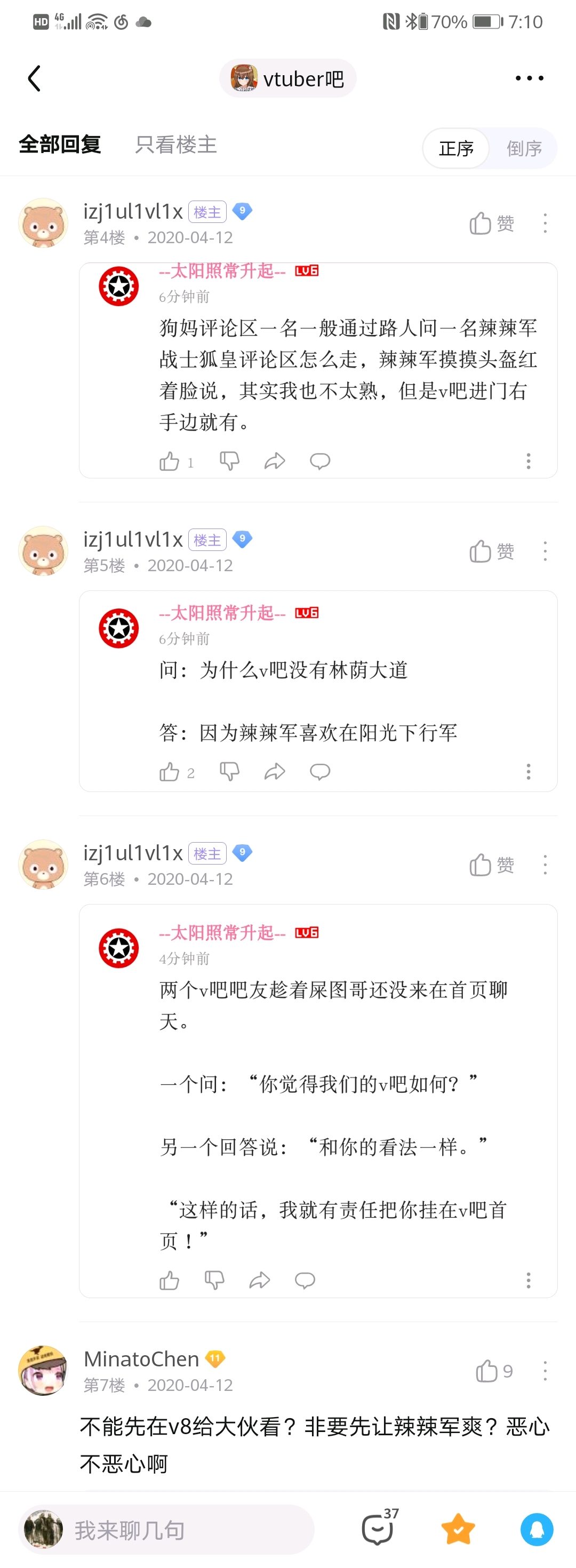 黑暗奈宝就属于那种魔怔辣辣军的招牌吧宝,狗吗的深度gachi,拿手绝活是复读机,基本就是那种看到哪个帖就整段复制粘贴来水帖,复读频率极高,我记得有一晚最离谱,整个版面都是他的复读帖😅