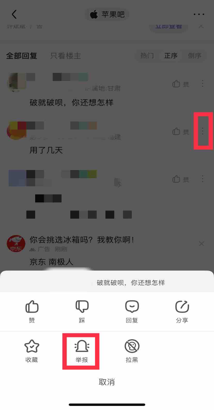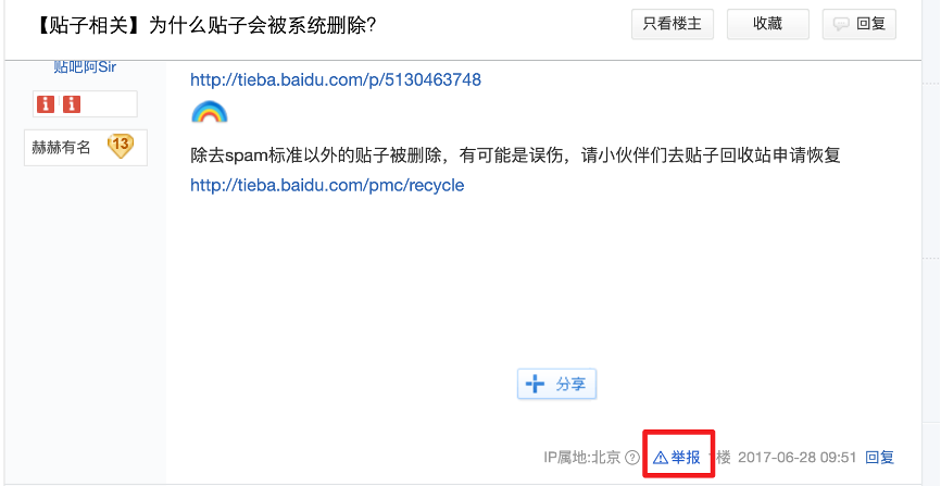 (3)在贴吧电端脑贴子及回复楼层下方,举报内容违规;