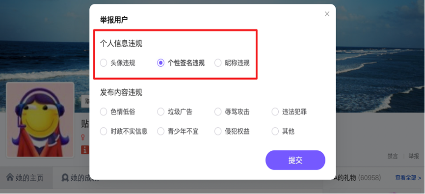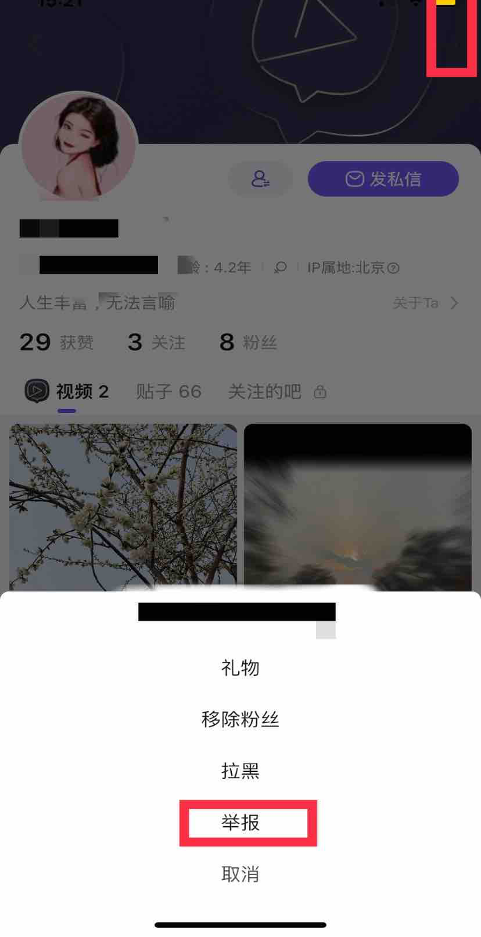 (2)在贴吧App进入Ta的个人主页,举报内容及个人信息违规;