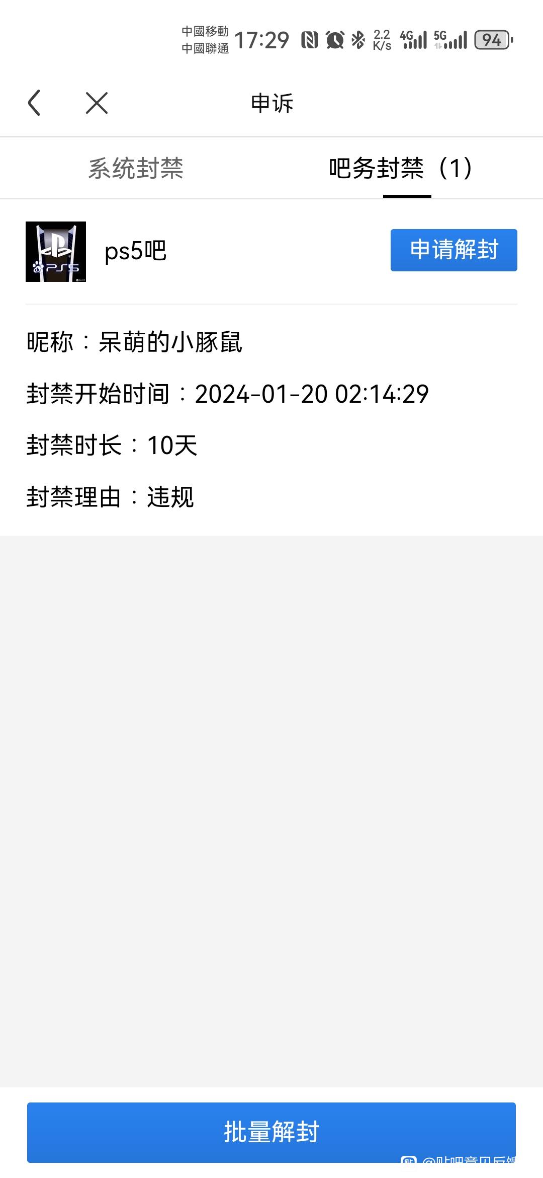1楼pid:1496987537482024/01/29 17:33:33贴吧用户_aN4X5yR 楼主 2级 从去年很早开始,我的账号就无法在ps5贴吧发帖、回帖和签到,经查证被吧务封禁10天。十天到后,依然被无限循环封禁至今。本人无任何不良发帖记录,且向ps5吧务申请解封无效,依然被不合理维持10天无限循环的封禁。本人在此投诉ps5吧全体吧务人员滥用吧务权力,无缘无故封禁正常用户ID。希望能将账号予以解封,并惩处ps5吧滥用吧务权力的责任人。#PS5##投诉##举报#