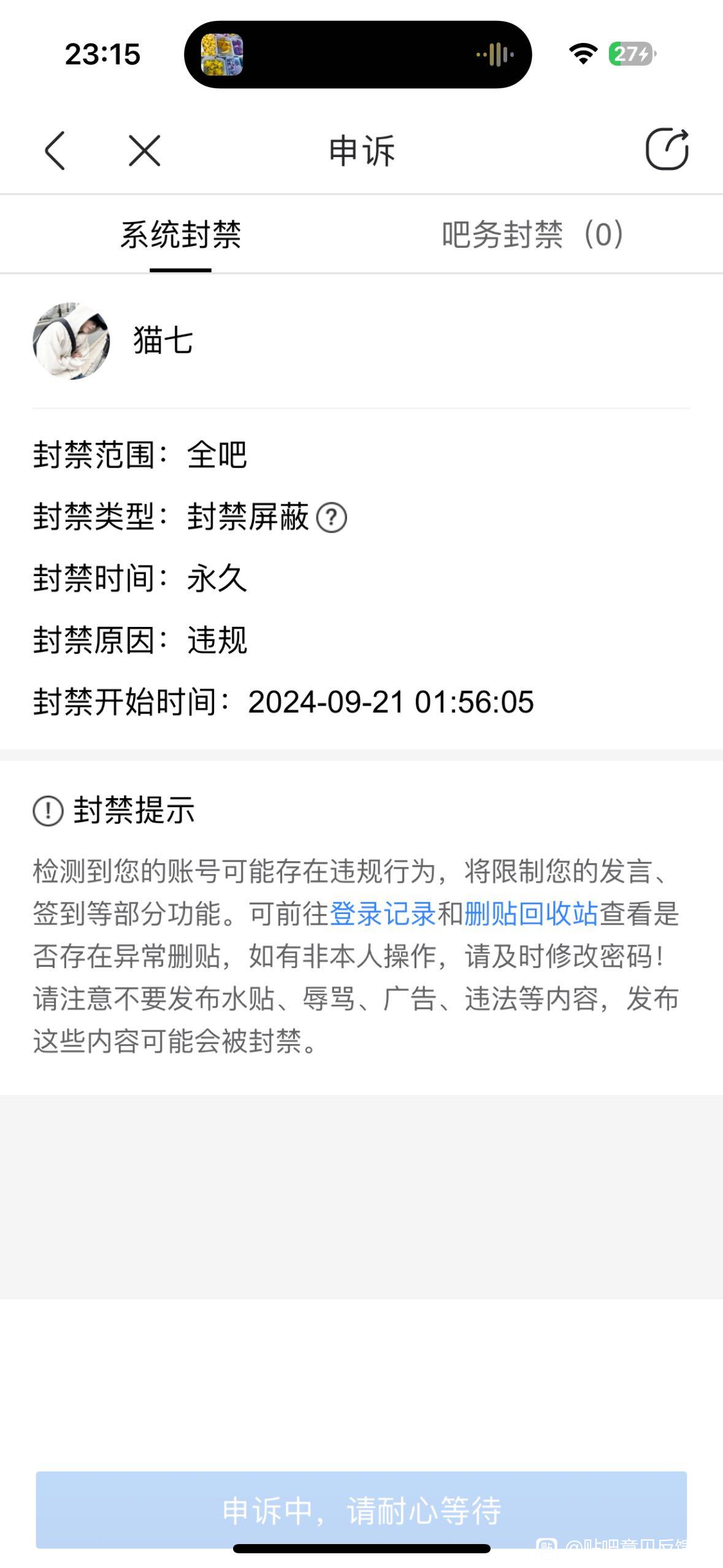魅力四射这个号被莫名其妙的全吧了,到现在还在申诉中