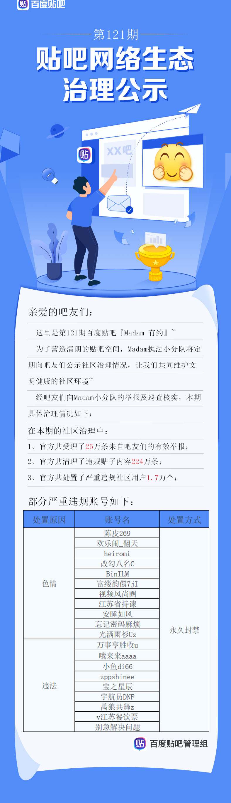 【治理公示】第121期 Madam有约--贴吧网络生态治理公示