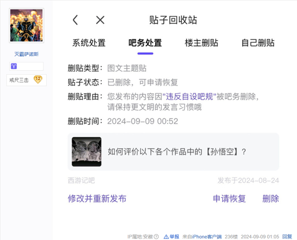 贴吧意见反馈吧 帮另外两个人投诉西游记吧吧务tid:92366649662024/10/25 17:49:2011670 0 0楼主:虚蟜最后回复:鸭鳄452025/12/04 08:38:571楼pid:1511227768792024/10/25 17:49:20虚蟜 楼主 1级 吧友1:简单说就是他看书发现【原著】铁扇公主那一章牛魔王的小妾写的是玉面【狸精】,而不是86版大家熟悉的玉面【狐狸】,于是就在吧里发帖询问并讨论了一下,结果帖子被删,她的吐槽见图,也就是说,她连讨论原著文字的帖子都被删了吧友2:就是简单的讨论一下不同作品的孙悟空而已。。。2楼pid:1529326267892025/12/04 08:38:57鸭鳄457级 去孙悟空吧发