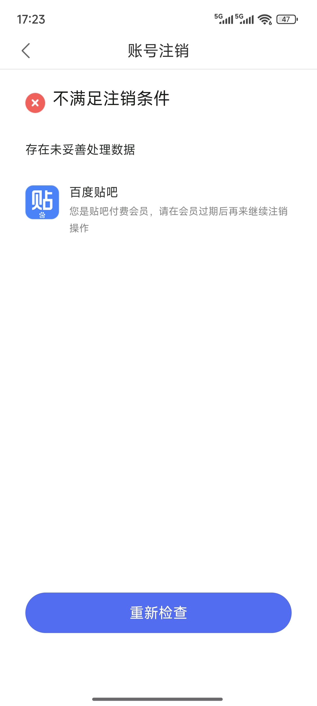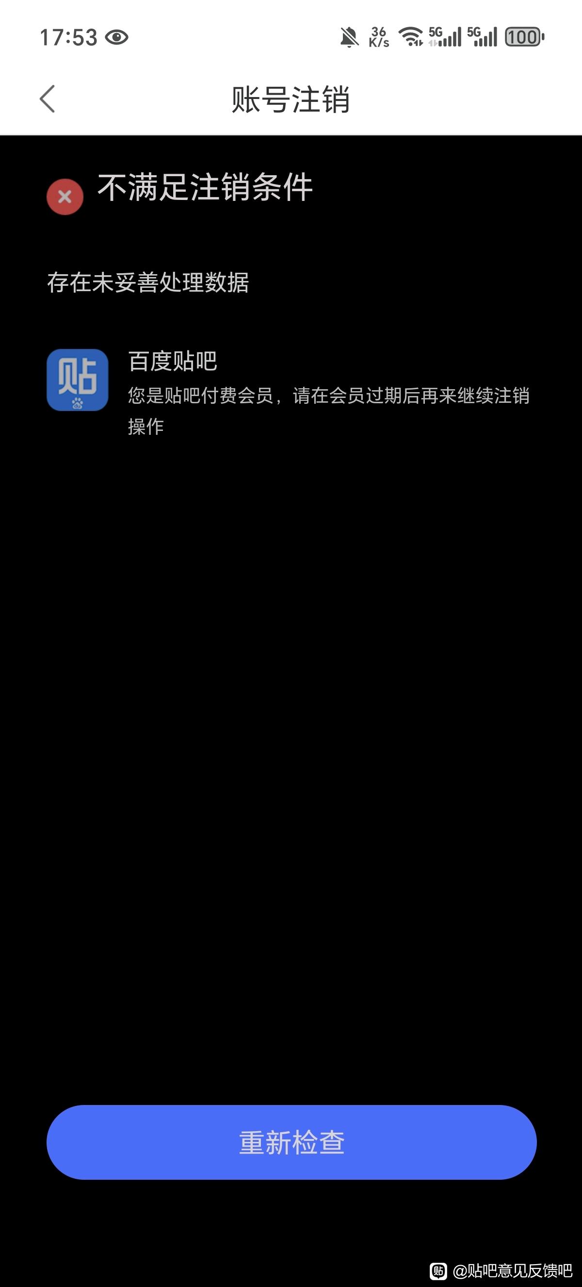 1楼pid:1521771116812025/06/01 11:58:36贴吧用户_J1R2eK9991 楼主 5级 贴吧会员过期一个多月,注销账号还是提示有会员无法注销。联系客服,来来回回处理一个多星期了,总是在核实。第一次告诉我处理完毕,然后一试还是不行,后面再反馈,就告诉我在审核等结果,无奈╮(╯▽╰)╭