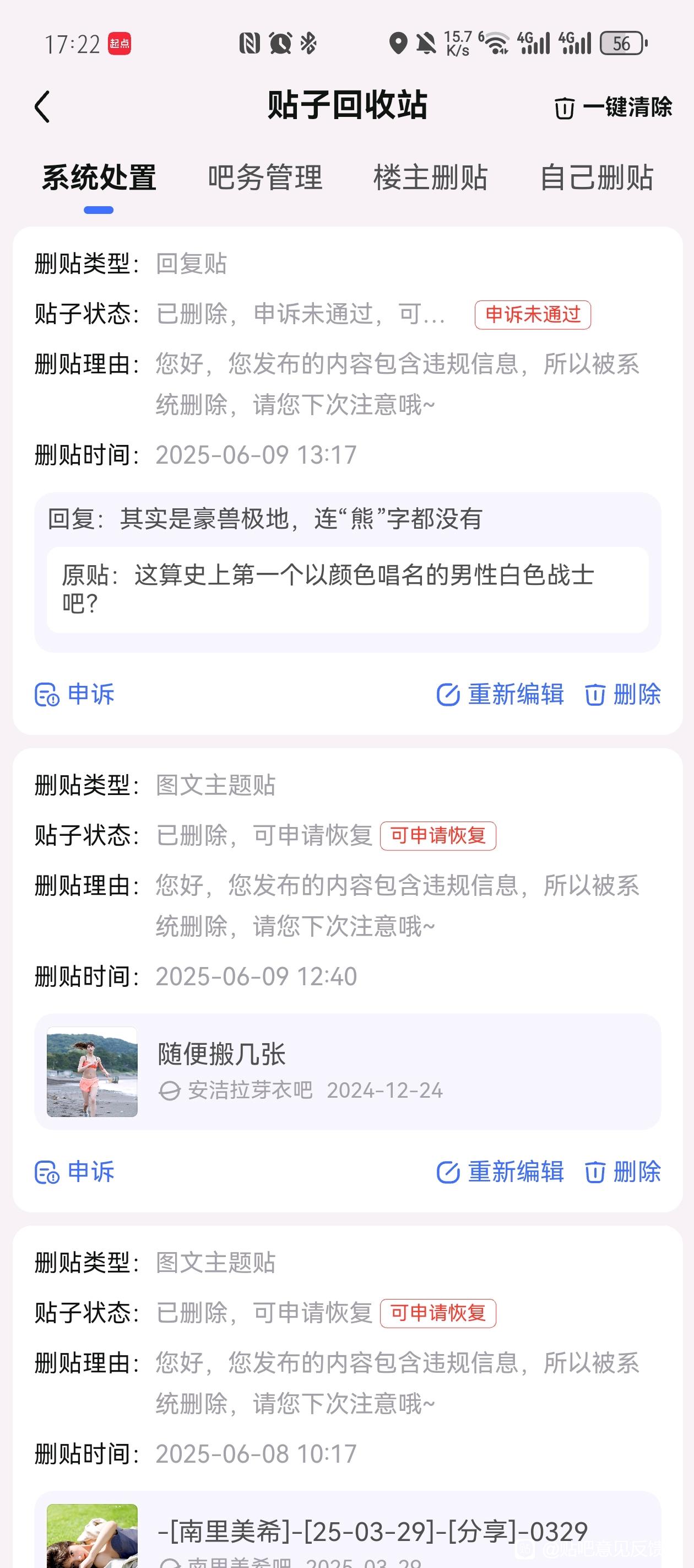 “还有那些写真,泳装写真被删了、申诉秒拒我认了,虽然那几个帖子是发了半个月一个月后突然删的。可是有一个就是正常的日常服装都能违规信息删除,申诉秒拒,百度连个真人后天都请不起了吗?”