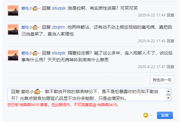 1楼pid:1522467111242025/06/16 09:13:38situqsk 楼主 2级 有个叫柏森森的吧务,滥用职权,一莫须有的理由删帖,禁言,对持不同意见者恶语相向,无端辱骂诽谤,对正常发言无故打压,动辄封号禁言,搞得本贴吧乌烟瘴气,长此以往失掉民心和吧员,必须引起重视,予以惩戒。