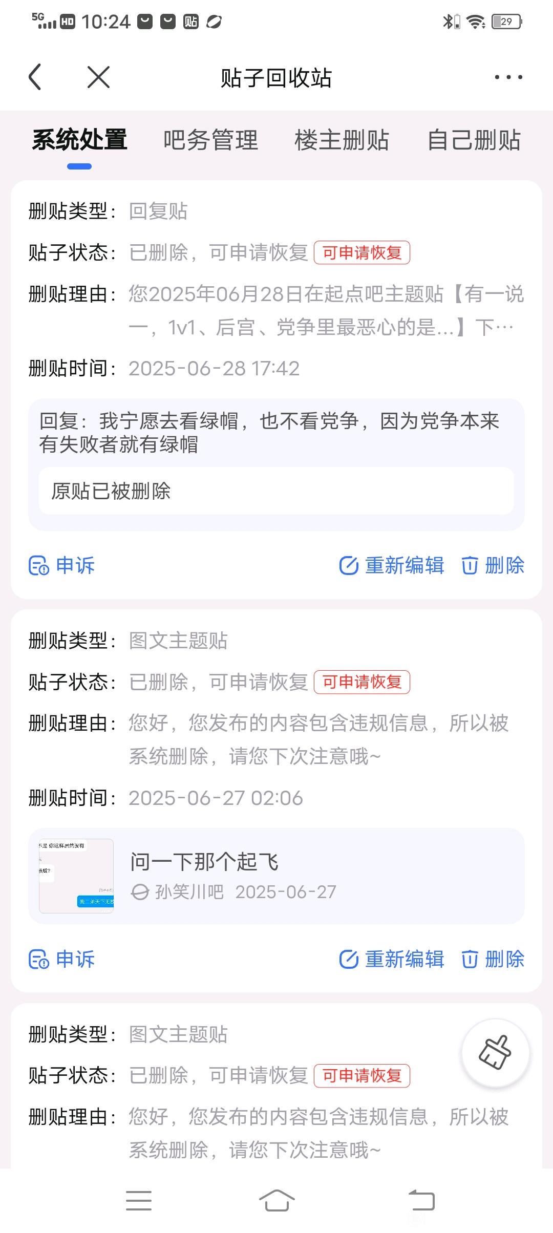贴吧意见反馈吧 我的帖子不管是被系统删的还是吧务删的在回收站里都找不到tid:98360654582025/07/01 10:26:00238 0 0楼主:阿库阿格 鸽子不鸽德最后回复:行路者818 船牵情022025/07/01 12:27:561楼pid:1523127720622025/07/01 10:26:00阿库阿格鸽子不鸽德 楼主 1级 怎么回事?还不让人申诉或者改动吗?不是一回两回的问题了而且不止我一个人有,以前也有人反应过,但现在我还是会出现这种情况,贴吧到底在干什么2楼pid:1523127823552025/07/01 10:28:26阿库阿格鸽子不鸽德 楼主 1级 @贴吧阿Sir @贴吧Madam3楼pid:1523132858232025/07/01 12:27:56行路者818船牵情0215级 没有提示吗~