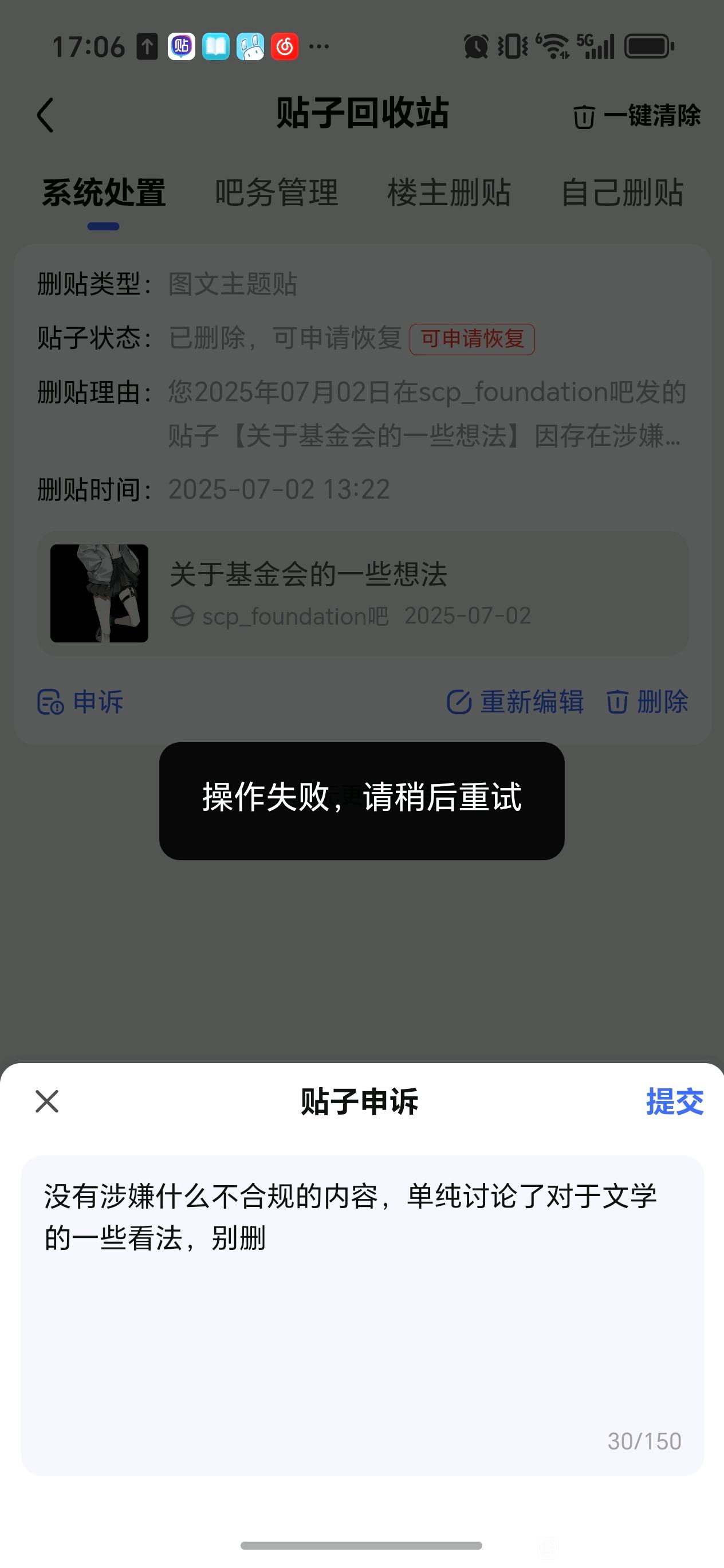 贴吧意见反馈吧 不是为什么不能申诉tid:98395341262025/07/02 17:23:022827 1 0楼主:证不明的余弦定理最后回复:透明漫 贴吧用户_JUDEUAe2025/07/06 03:56:281楼pid:1523190938712025/07/02 17:23:02证不明的余弦定理 楼主 1级 不知道为什么,一直没法申诉2楼2条pid:1523191517282025/07/02 17:37:32wafd666.衛AI蕟大歩烮颠an.7级 申诉多了就会这样证不明的余弦定理 楼主 1级 我根本就没申诉过,第一次申诉就不行wafd666 .衛AI蕟大歩烮颠an. 层主 7级 回复 证不明的余弦定理 :那就别申诉,申诉也没用3楼pid:1523309487642025/07/05 10:00:57whspjys老任1级 系统封的,很容易解封,吧务封的那就封着4楼pid:1523345963862025/07/06 03:56:28透明漫贴吧用户_JUDEUAe2级 我也遇到了