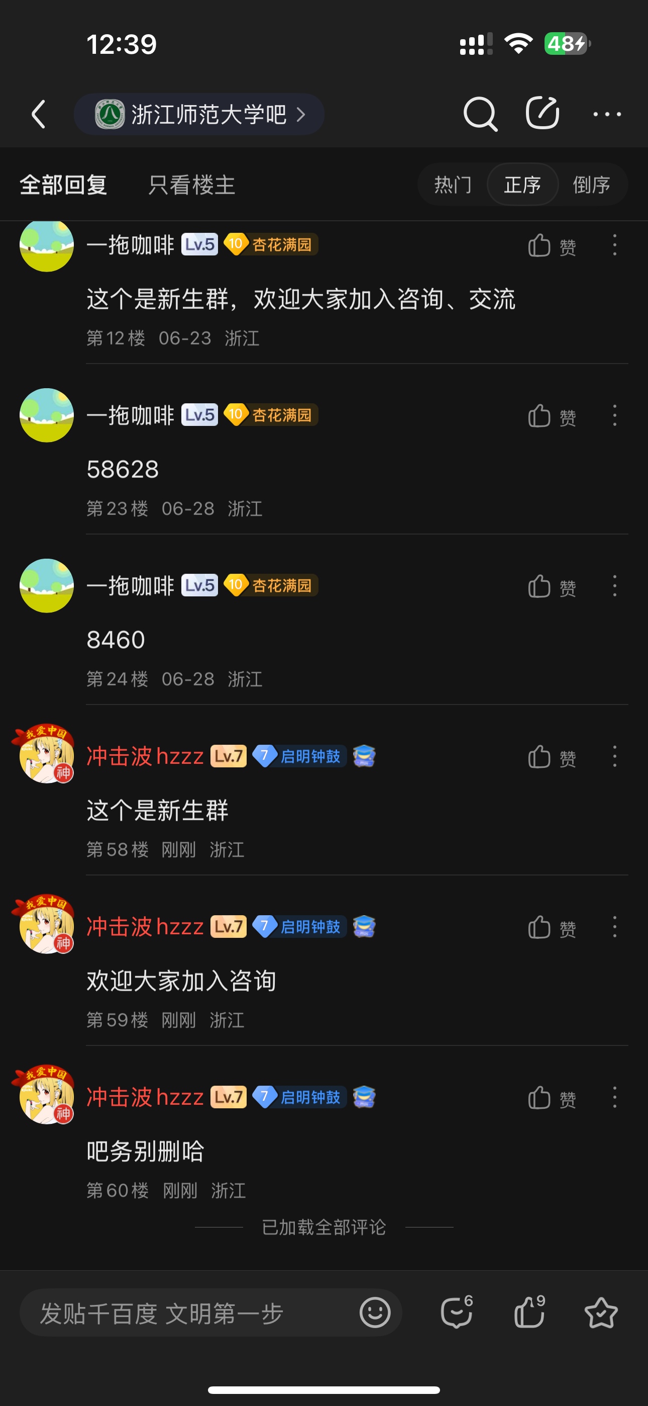 2.吧主违规置顶商业引流群号,以浙江师范大学新生交流群的名义发布移动营业厅校园网推销群,且经多次投诉后屡教不改,转而使用马甲小号发布引流群号,多次投诉无果,故来到贴吧吧主吧进行投诉。
